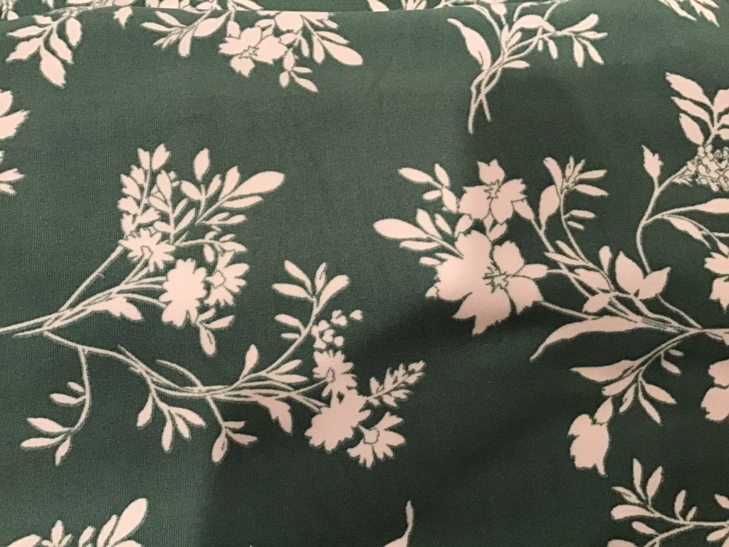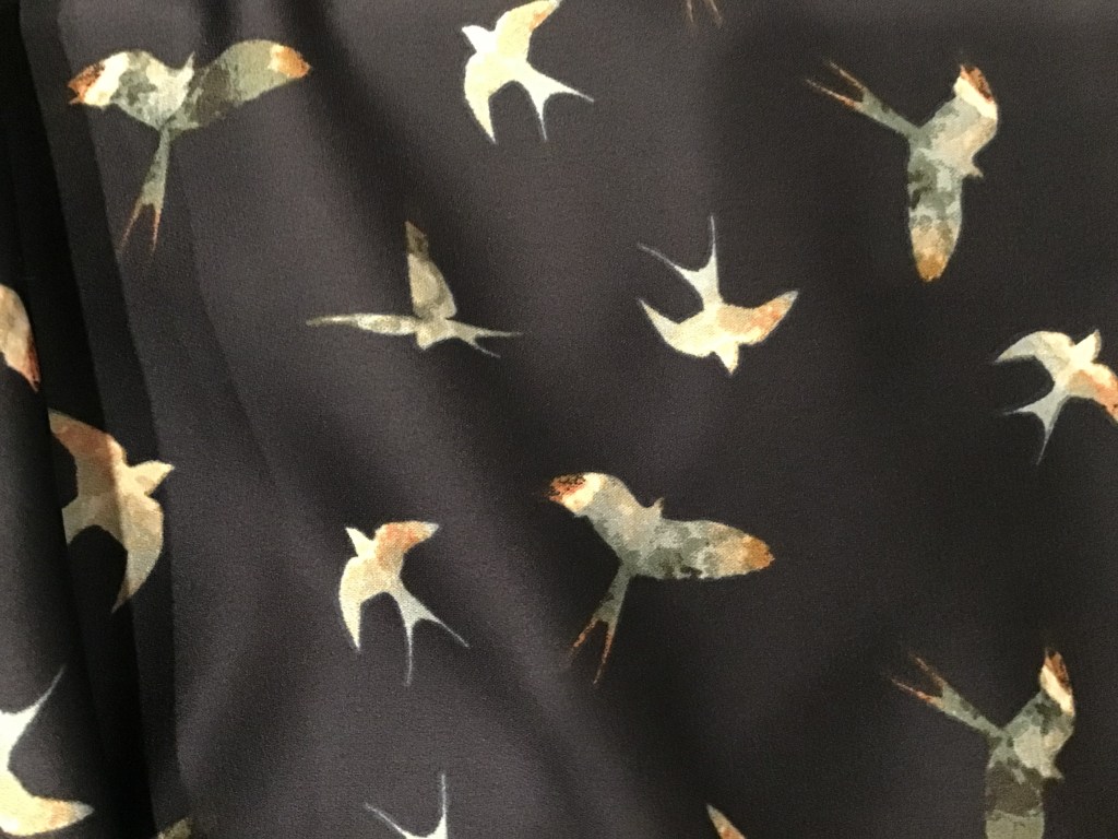 Navy blue is a base color I want to focus on this year. Today I took a road trip to Joann’s and found this nice blouse weight polyester. The background is a very dark navy and features birds. It definitely appears black in the photo, but oh well.
