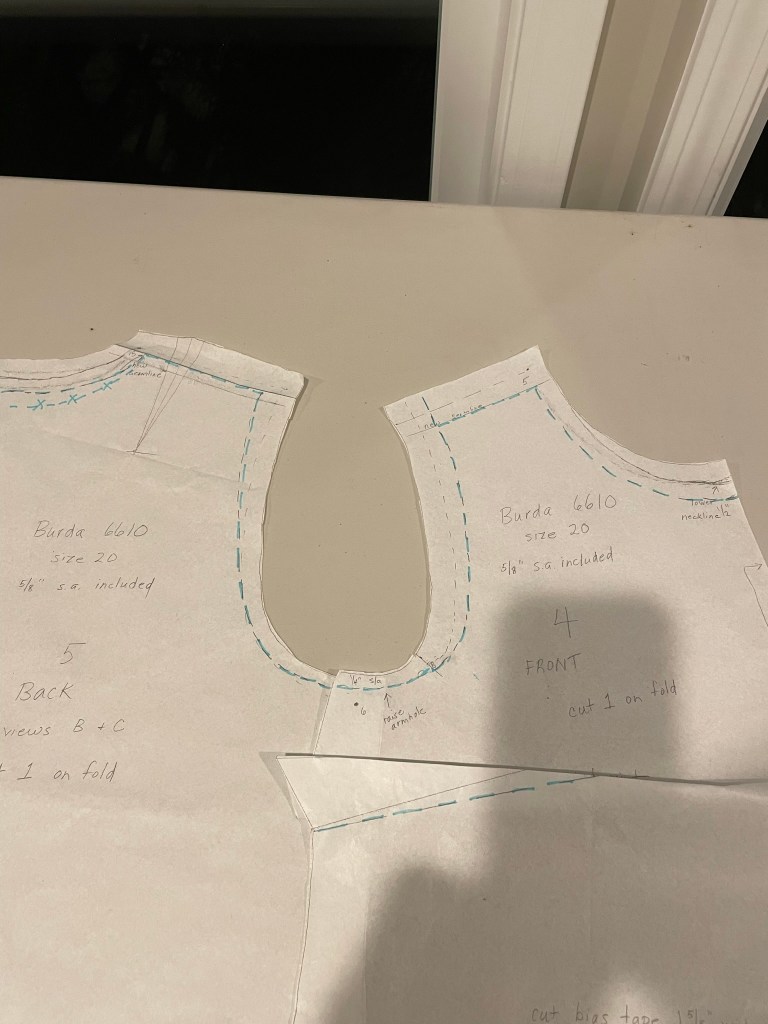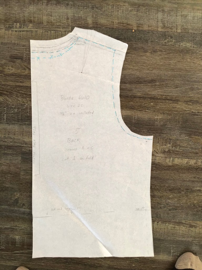 I’ve been busy today. I spent some time measuring the pattern pieces of Burda 6610, and comparing those measurements with my own body measurements. I also measured a couple of RTW tops in my closet. Eventually I decided to trace a size 20 and go from there. So now I have this: