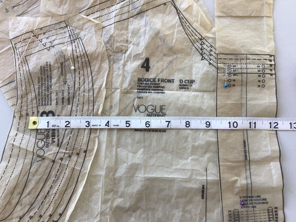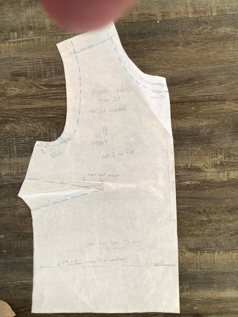 I ended up with a few changes to the basic pattern. I removed 1/2 inch from the shoulder length, raised the shoulder 3/8 inch on each side, raised the armhole 1/4 inch, lengthened the bodice 1 inch just above the waist, and lowered the bust dart 1 inch.