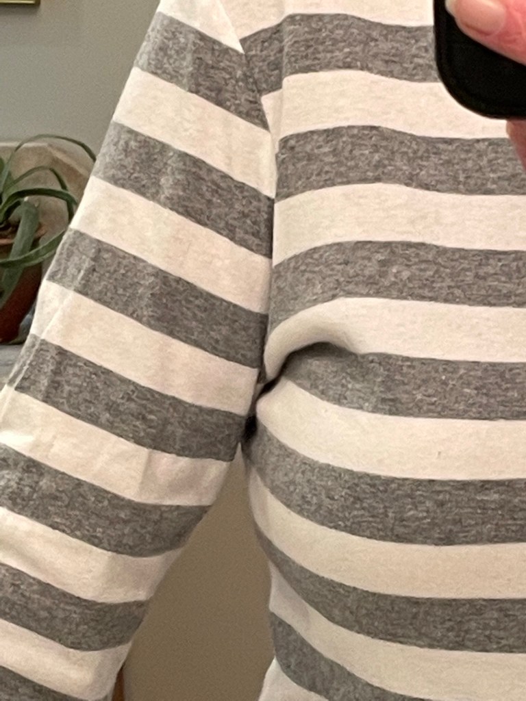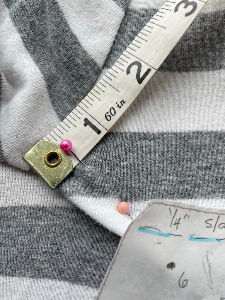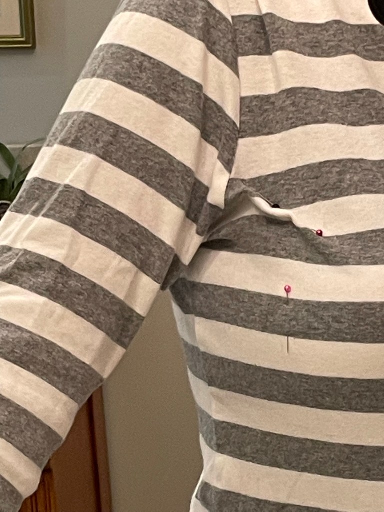 I started by trying on two of my most worn RTW tee shirts. I had a good look in the mirror because I knew there were some changes to be made in order to get a better fit and appearance. One dead giveaway that this is RTW is the mismatched stripes.