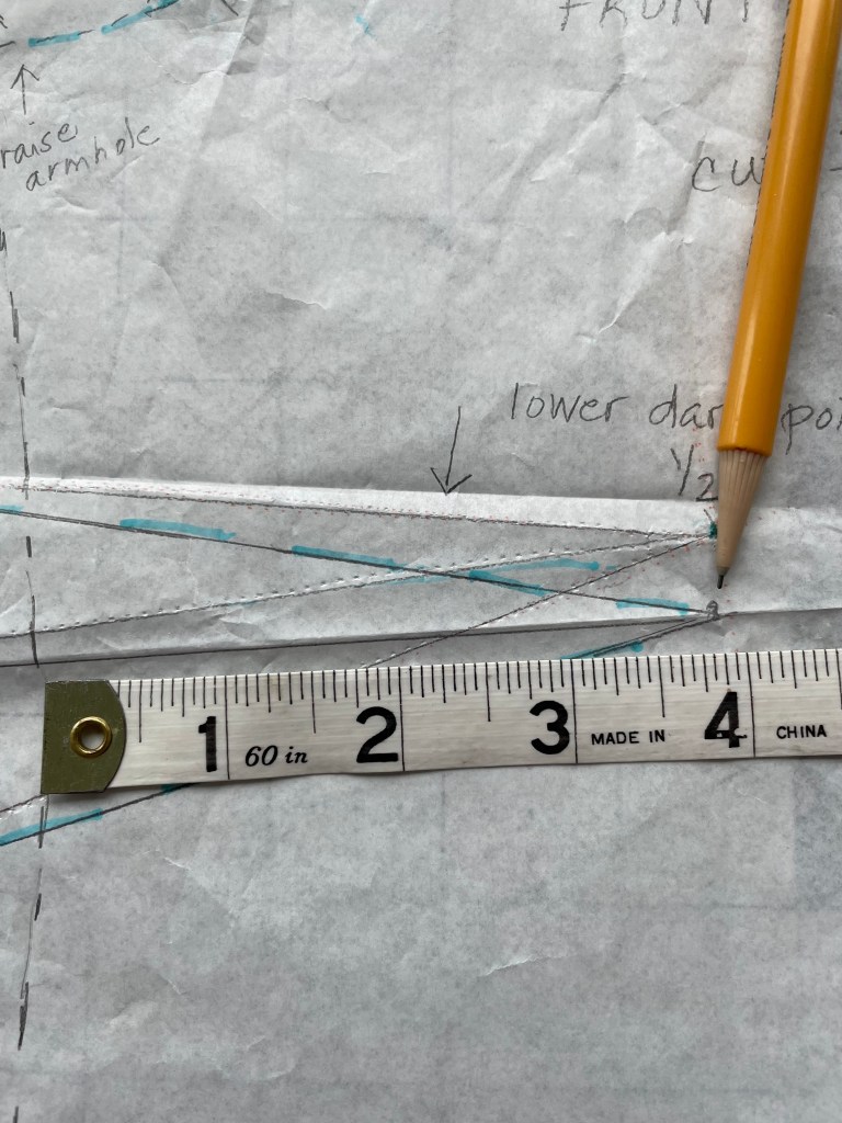 In the next photo I have pinned out the armhole and marked where the bustline dart should end.
