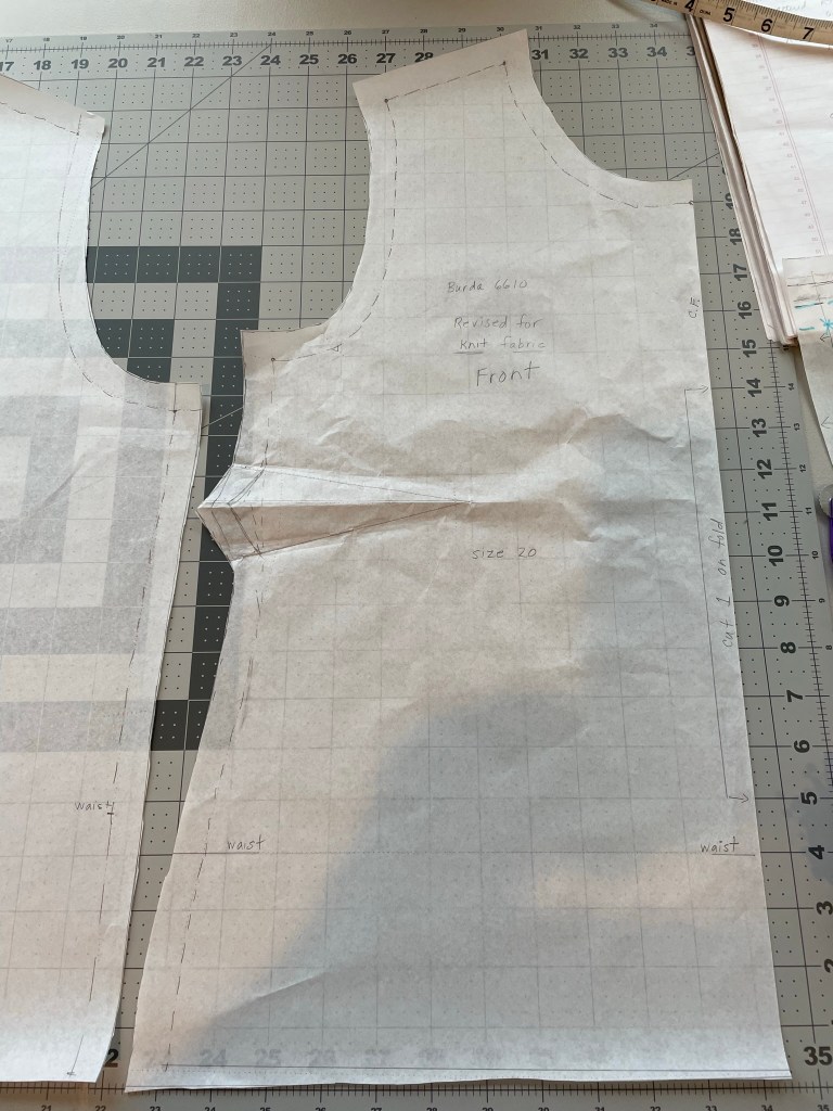 I spent the morning measuring and comparing three different knit RTW tops that I wear frequently. In each case I cross checked these against my revised Burda 6610.